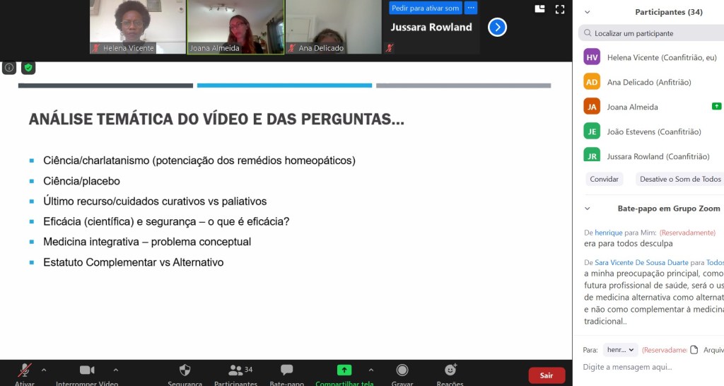 Os primeiros três SCV realizaram-se em maio de 2020, mas apenas foi possível agendar o último SCV (medicinas alternativas e complementares) para setembro. No total, conseguimos assegurar a participação de 100 estudantes, que completaram todas as fases do projeto. As desistências ao longo das sessões foram pouco significativas. O debate com as especialistas foi animado e os argumentos encontrados criativos e bem justificados, apesar de muitas vezes a(o)s estudantes não se identificarem com a posição que tinham de defender.