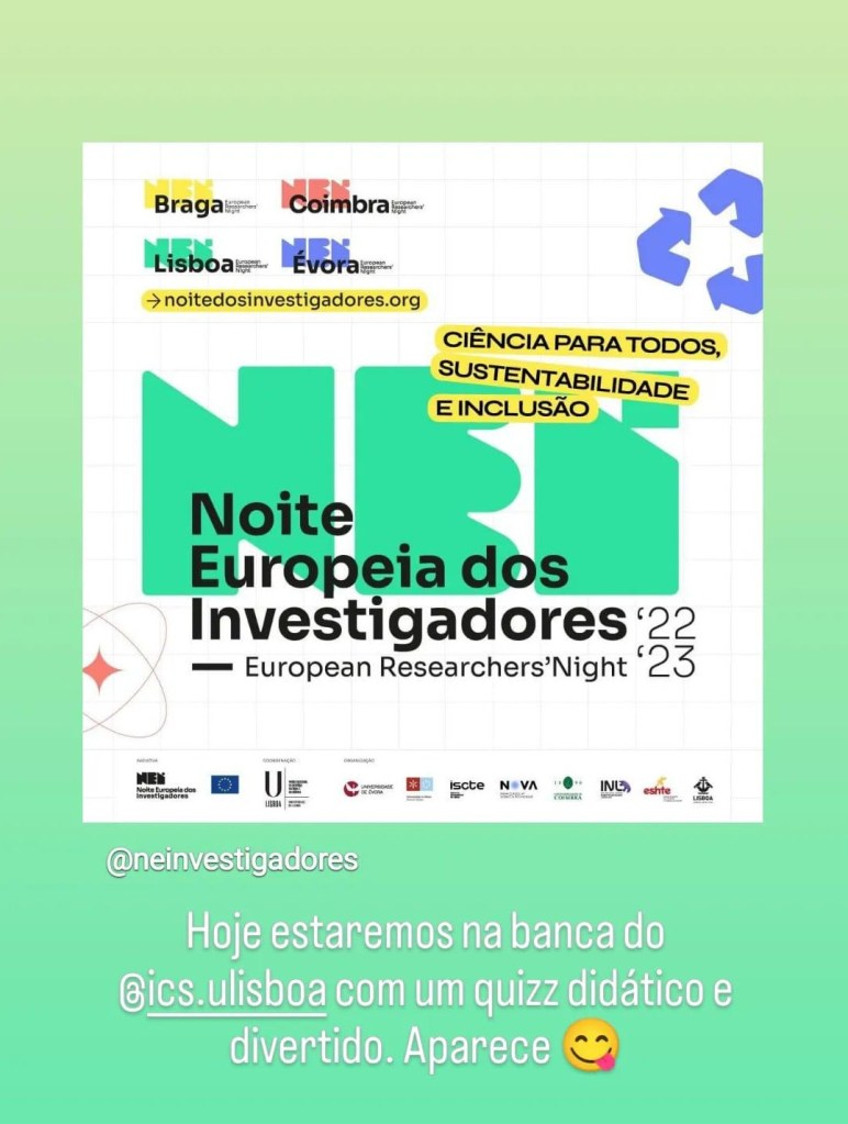 O Instituto de Ciências Sociais (ICS-UL) participou, no passado dia 30 de setembro, na Noite Europeia dos Investigadores (NEI). Esta é uma iniciativa dedicada a aproximar a comunidade académica e a sociedade civil, que acontece em simultâneo em diferentes cidades do país. Em Lisboa é promovida pelo Museu Nacional de História Natural e da Ciência e pela Universidade de Lisboa, em colaboração com a Universidade Nova de Lisboa representada pela Faculdade de Ciências e Tecnologia, o ISCTE – Instituto Universitário de Lisboa, a Escola de Hotelaria e Turismo do Estoril e a Câmara Municipal de Lisboa. Acontece entre as paredes do próprio museu, no Jardim Botânico de Lisboa, no Jardim do Príncipe Real e online. Em 2022, este evento consistiu num programa variado, incluindo visitas orientadas, Cafés de Ciência, espetáculos, para além das diversas atividades promovidas por universidades e centros de investigação. Dado o tema deste ano, “Ciência para todos – sustentabilidade e inclusão”, e à semelhança de edições anteriores, o ICS não poderia mais uma vez deixar de estar presente (Figura 1), especialmente tendo em conta o seu compromisso com as atividades de extensão universitária e de promoção do diálogo ciência-sociedade.