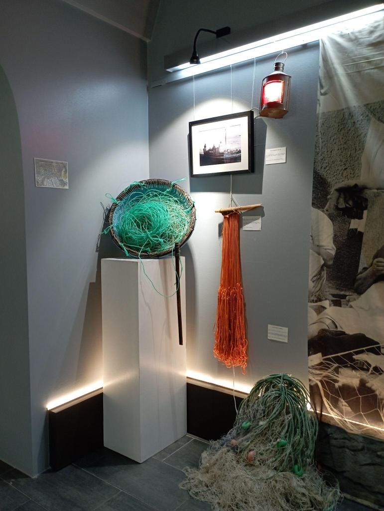 Figura 2: Um vislumbre da Mostra de Objetos e Artefactos da Pesca. Nesta área, intitulada O Barco é uma Casa, pretendemos destacar o barco enquanto uma entidade própria, semelhante a um lar. Ao qual se juntaram instrumentos de trabalho, nomeadamente, artes de pesca, mas também outros objetos que têm lugar a bordo, associados, por exemplo, à confecção de comida. Fonte: as autoras.