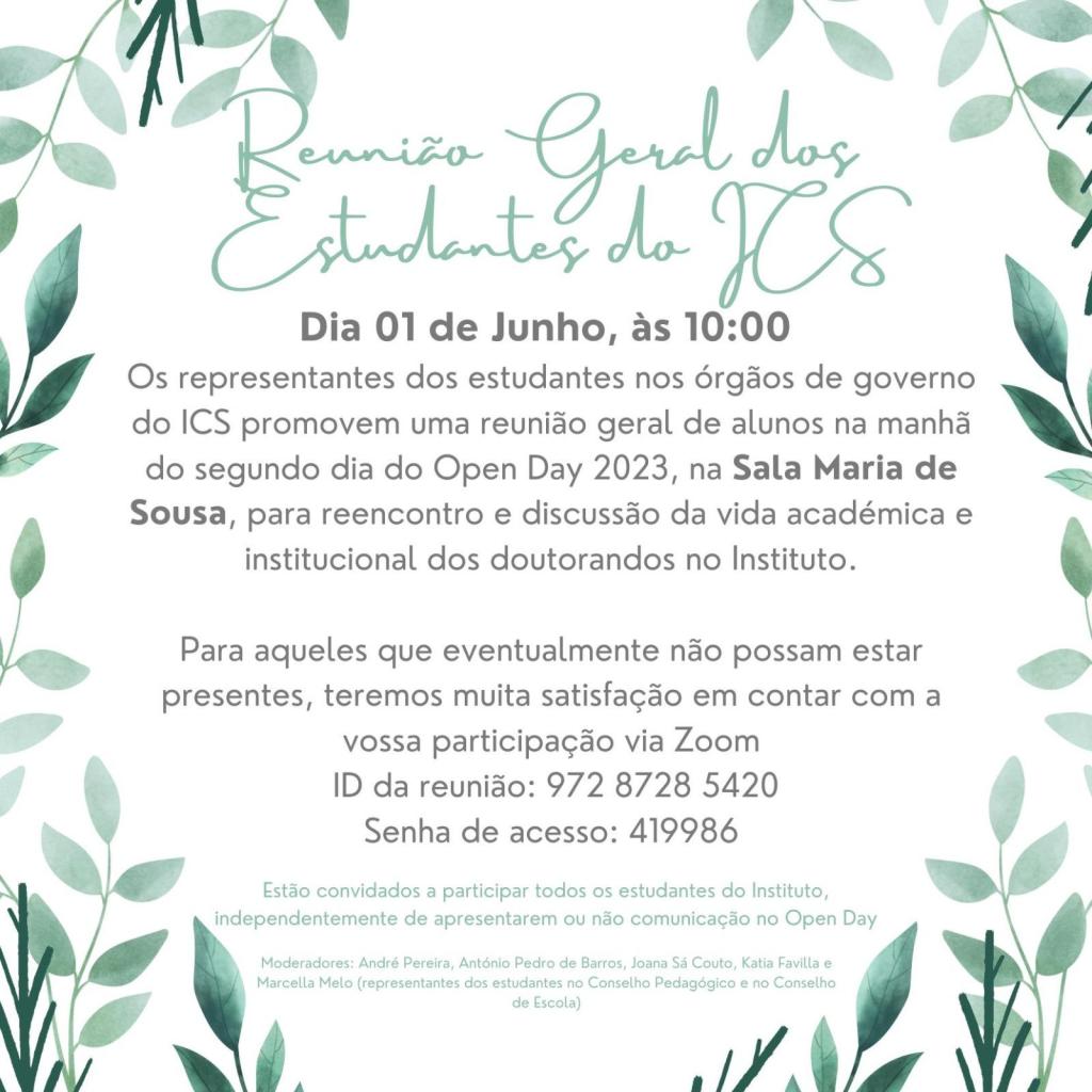 Devido ao seu papel no CP e no CE, os/as representantes dos/as estudantes nestes órgãos presidiram a uma reunião geral dos estudantes do ICS, no dia 1 de junho, no âmbito do programa “Open Day”, organizado pelo CP. Desta reunião resultaram novas sinergias, foram levantados problemas e sugestões relativamente ao funcionamento do Instituto que transmitimos aos serviços académicos e procurou-se partilhar o trabalho tanto do CP como do CE. No âmbito deste encontro, foi também importante sensibilizar os estudantes para a recém criada Provedoria do ICS, cuja apresentação decorreu no mesmo dia.