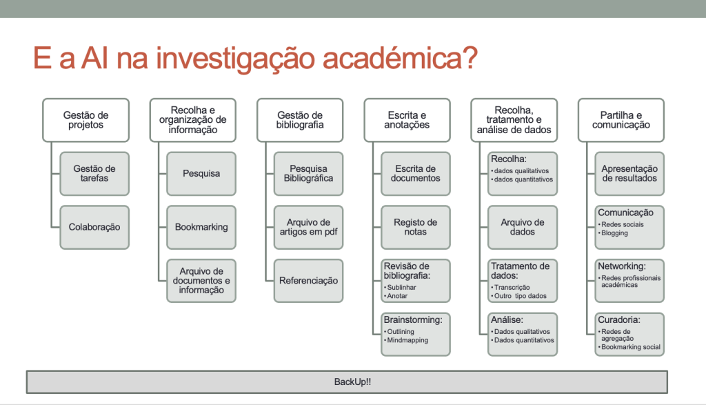 No âmbito desta aula, criei há uns anos um esquema que ilustra diferentes áreas em que as ferramentas digitais são utilizadas na investigação académica. O esquema é apenas ilustrativo e intencionalmente não exaustivo, sendo um dos exercícios propostos aos alunos pensar em outras áreas que não estão representadas. Ao preparar a aula deste ano, deparei-me com a necessidade de integrar uma reflexão sobre o uso de IA na investigação. Em vez de expandir o esquema identificando novas funcionalidades e áreas de aplicação, limitei-me a apresentar o esquema desta forma:
