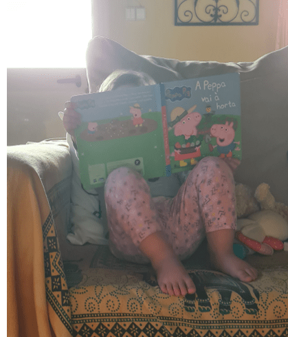 Figura 1 Alice a ler um livro da Porquinha Peppa (Maio, 2023, foto da autora)