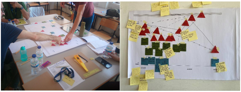 Ainda antes do almoço, a partir da técnica do sociograma ou “mapa de atores”, discutimos os posicionamentos dos diferentes atores sociais (institucionais, base associativa e base social) que integram os diferentes níveis das políticas de habitação face à questão em debate – a favor, afins, diferentes ou em contra –, de acordo com o grau de poder e os tipos de relações atribuídas a cada um. Este exercício serviu como ponto de partida para a sessão da tarde, ajudando-nos a refletir “com quem” devemos planear a superação das fraquezas e ameaças identificadas nas mesas anteriores.