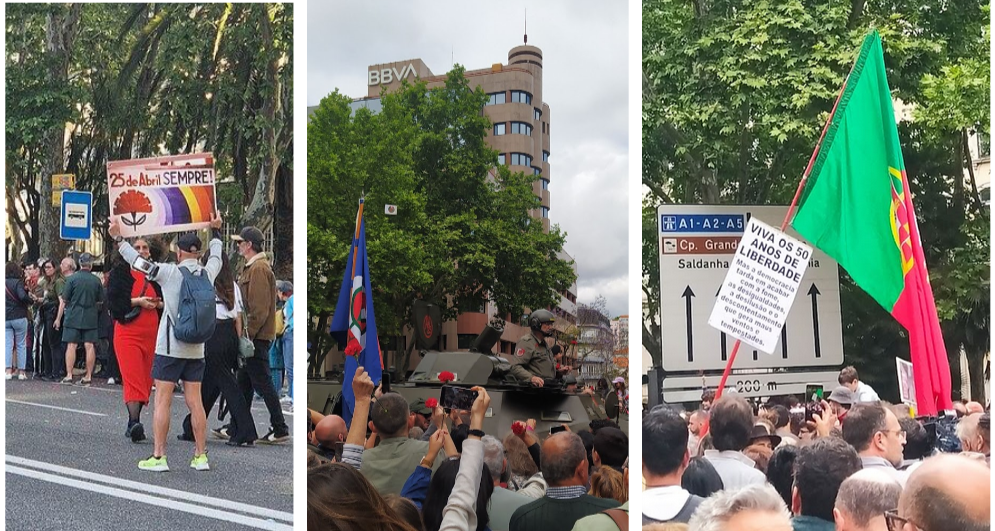 Figura 2,3,4: Desfile comemorativo dos 50 anos do 25 de Abril de 1974 (Avenida da Liberdade, Lisboa, Portugal a 25 de Abril de 2024)Fonte: figuras 3 e 4 fotos de Luisa Rossini; figura 2 RitaFMatos (https://commons.m.wikimedia.org/wiki/File:25_de_Abril_de_2024_08.jpg).